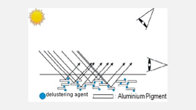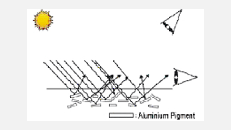 The trait of effect metal varnishes is brilliance and luminance of the varnishing. Special significance above this has the Flip-Flop or two tone effect, which results from the alteration of the luminance sensation during modification of the viewing angle. This effect depends on the utilized metal pigment and its adjustment in the varnish film.