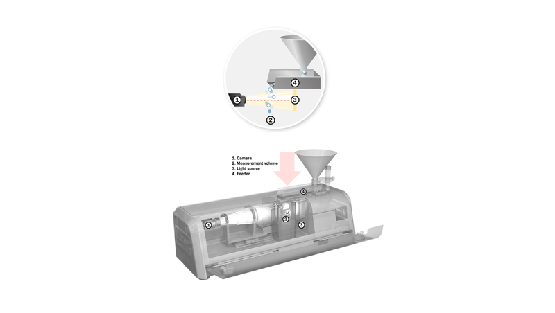 For dry measurement, the sample material is filled into the funnel and conveyed to the falling chute via the automatically controlled feeder, which its U-shaped cross section ensures a good material feed. There, the sample falls through the measuring chamber between the camera and LED strobe light into an easy to clean sample collecting vessel. The images recorded continuously during this process offer a variety of evaluation possibilities. And the sample remains undamaged and completely intact throughout the entire analysis process.